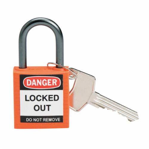 Brady® Safety Padlock, Anti-Spark Compact, Alike Key, Orange, LOTO-9 Fiberglass Reinforced Nylon Body, 0.2 in Shackle Dia, 1 in Shackle Height, 3/4 in Shackle Width, Polished Chrome Aluminum Shackle, 1.4 in Body Length, 1.2 in Body Width, 5-Pin Tumbler Cylindrical, DANGER LOCKED OUT DO NOT REMOVE Legend