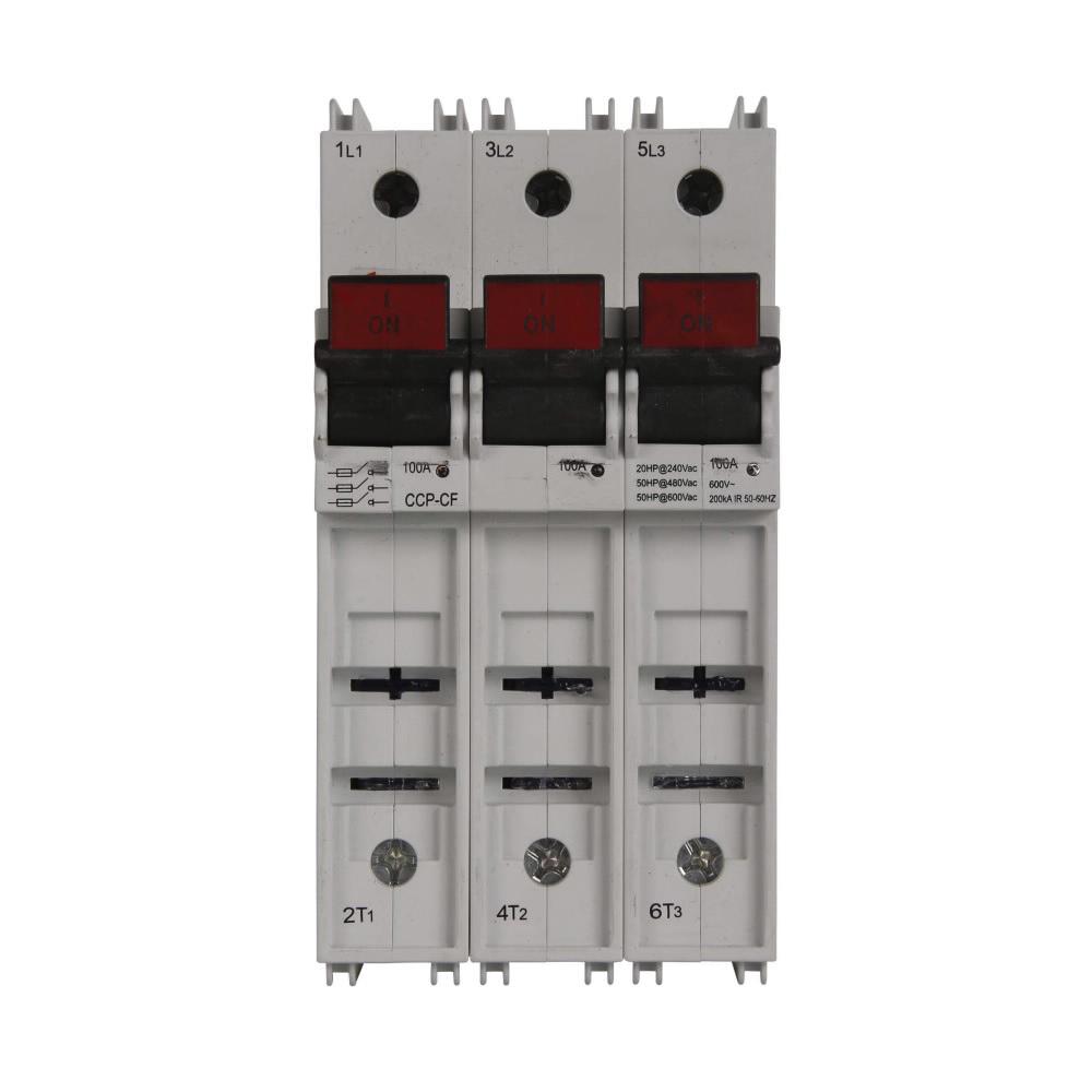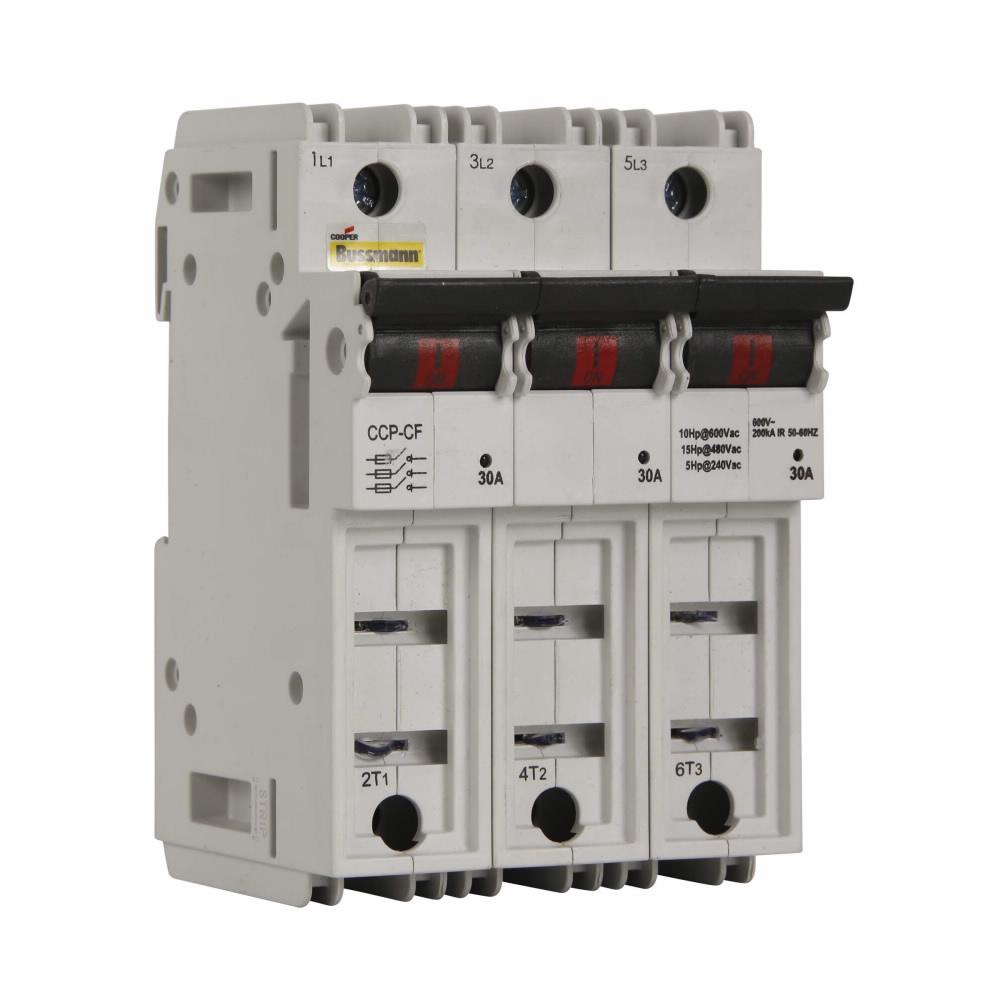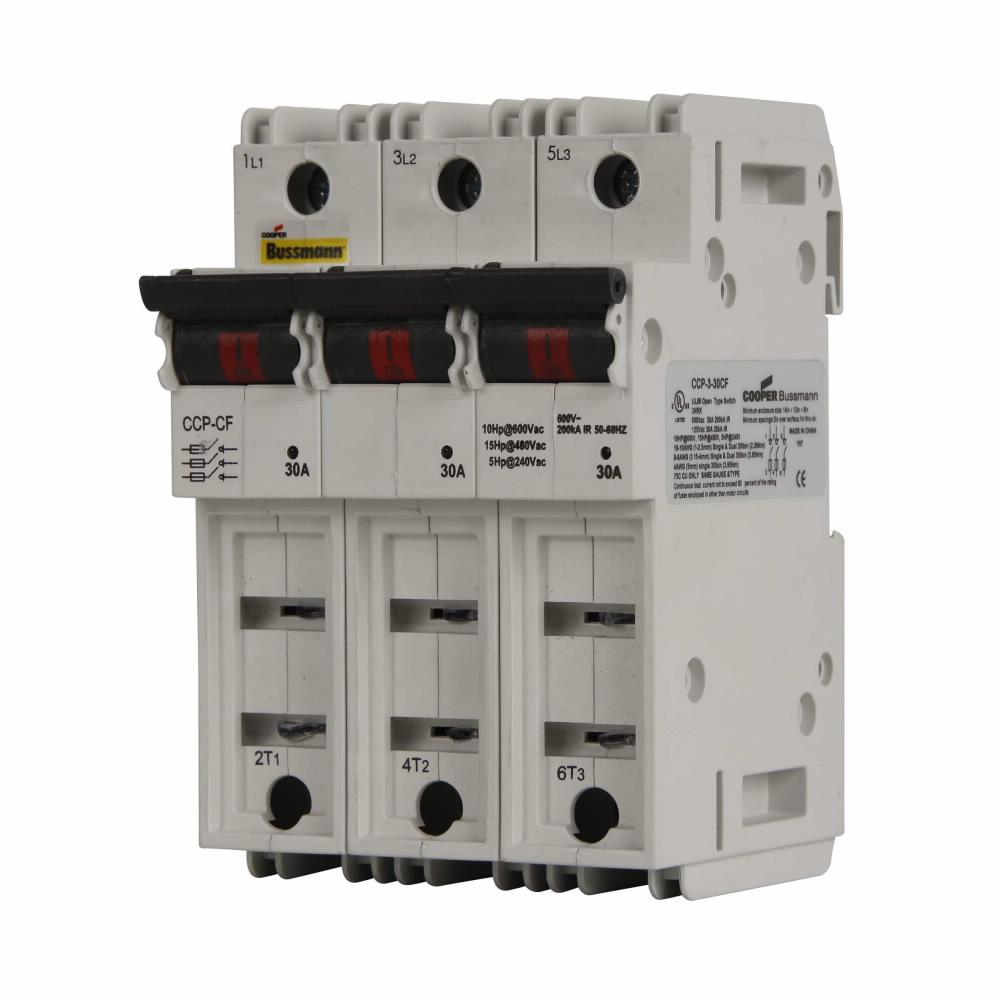 Bussmann CUBEFuse® Compact Circuit Protector, Series: CCP, 600 VAC, 30 A, 3 Pole, Class CF Fuse, 18 to 6 AWG Wire, Solid/Stranded Copper Wire, DIN Rail Mounting, -20 to 75 deg C Operating, 3 in Width, 4-1/2 in Height, 3 in Depth