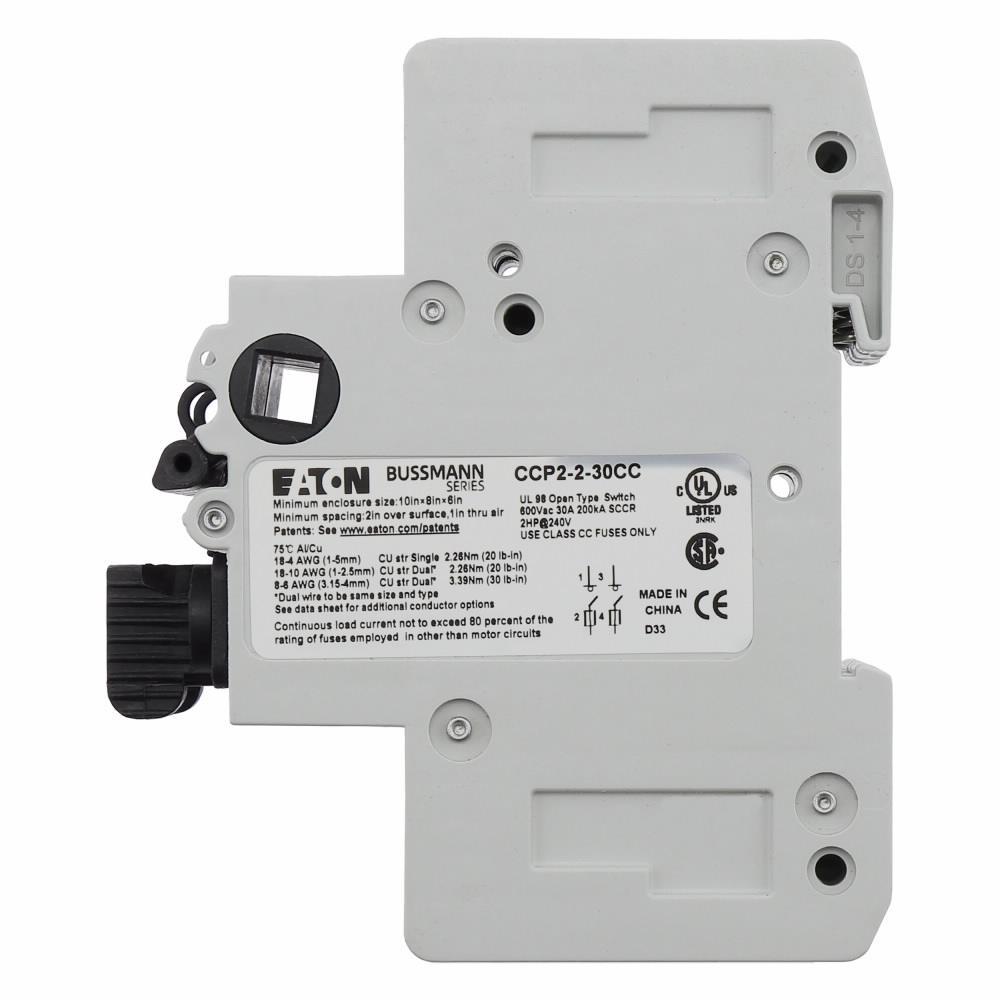 Bussmann Compact Circuit Protector Disconnect Switch, Compact Fused, 600 VAC, 125 VDC, 30 A, 2 Pole, DIN Rail Mount, -4 to 167 deg F Operating, 3.3 in W, 8.1 in Height