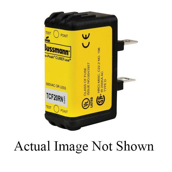 Bussmann Low-Peak™ CUBEFuse™ Time Delay Fuse, Current Limiting Inrush Current Withstand, Series: TCF, 20 A, 600 VAC/300 VDC, 100/300 kA Interrupt, Class: CF, 10 s at 500% Response, Blade Terminal, Chassis/DIN Rail Mount, Square Body Type, Dual Element, Glass Filled Polyethersulfone, 1.88 in L x 0.75 in W x 1 in H Body Size
