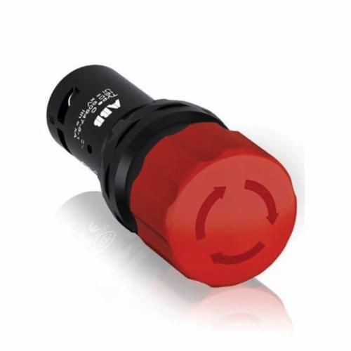ABB Non-Illuminated Pushbutton, Compact, Series: CE3T, 0.03 mm H x 0.03 mm W x 0.073 mm D Size, 2NC Contact Configuration, Maintained Contact Mode, 1.5 A at 120 VAC Contact, Twist-Release Operator, 2 Positions, Legend: Emergency Stop, Bezel/Housing: Plastic, Mushroom Head Actuator, Screw Terminal, NEMA 1/3R/4/4X/12/13/IP66 Enclosure, Panel Mounting, Plastic, Red/Black, Environmental Conditions: -25 to 70 deg C Operating Temperature