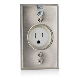 T5261-CH Straight Blade Tamper Resistant Recessed Single Receptacle with Clock Hanger Hook, Single Gang, 125 VAC, 15 A, 2 Pole, 3 Wire, Commercial Specification Grade, Smooth Face, Back or Sided Wire, Grounding, 5-15R, Stainless Steel