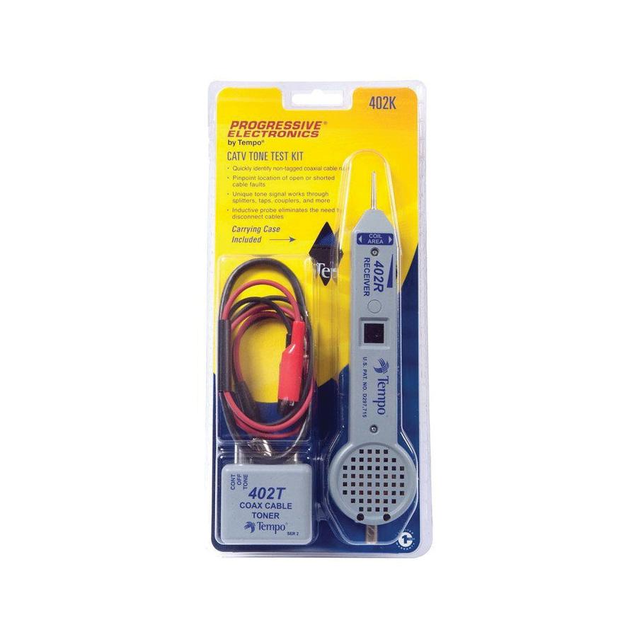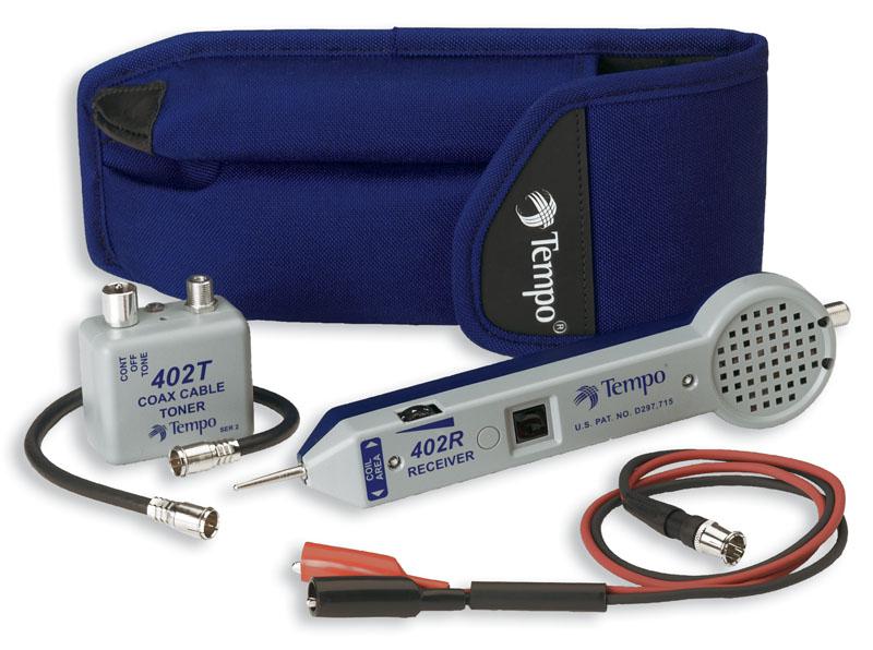 Each kit consists of: one transmitter, one receiver, one male F-to-F connector adapter cable, one male F-to-alligator clip adapter cable, and a 700C carrying case. designed specifically for the CATV industry, the model 402K will send tone through any passive device along the cable path. now you can tone through splitters, directional couplers and traps. no more long delays trying to figure out non-tagged or mis-tagged cable drops. the model 402K is simple to use and provides fast, accurate results. the transmitter and receiver are equipped with female F connectors and the kit provides both audible and LED test and tone indications. the addition of optional adapter test leads allows the 402K to be used on distribution cables as well as wire pairs or single conductors.