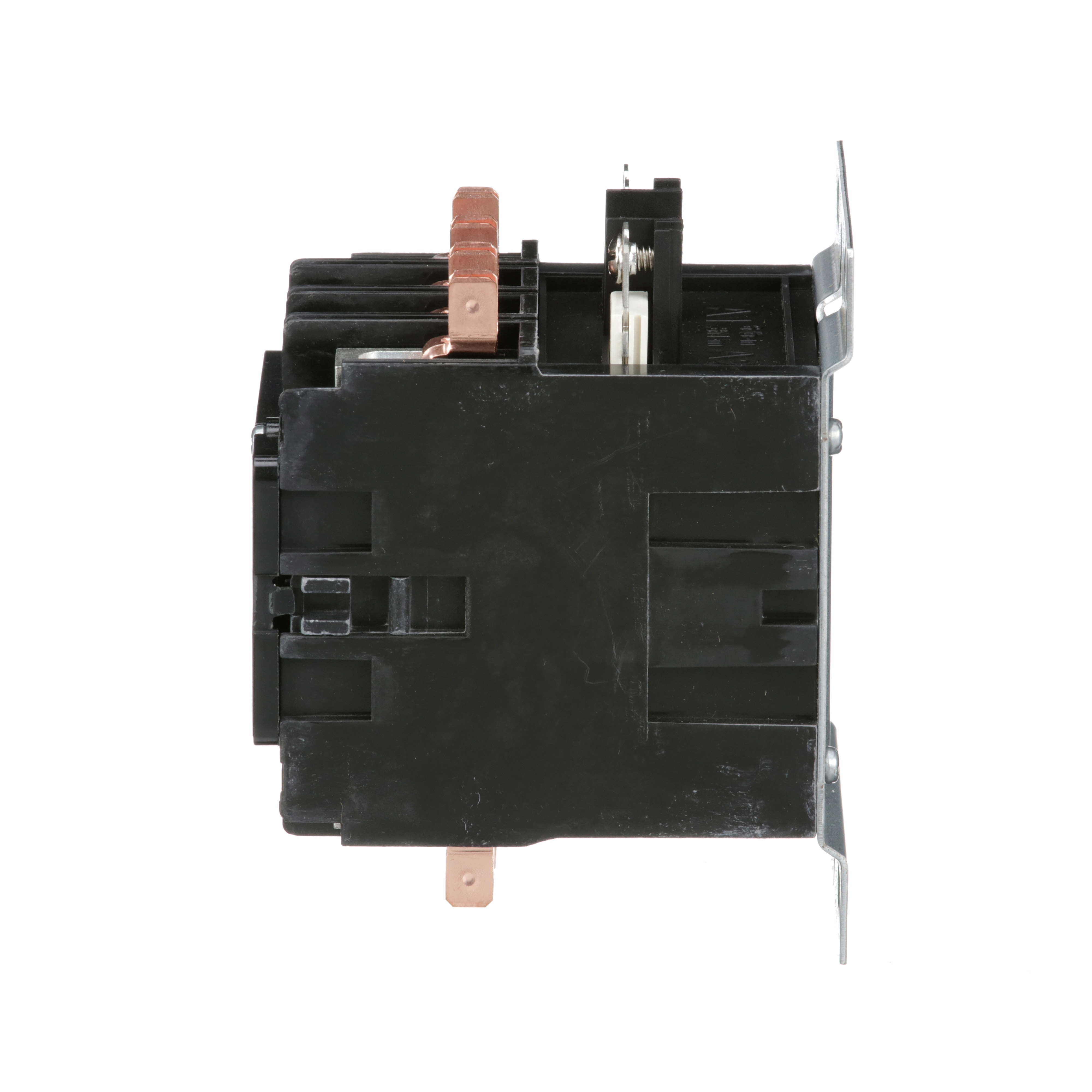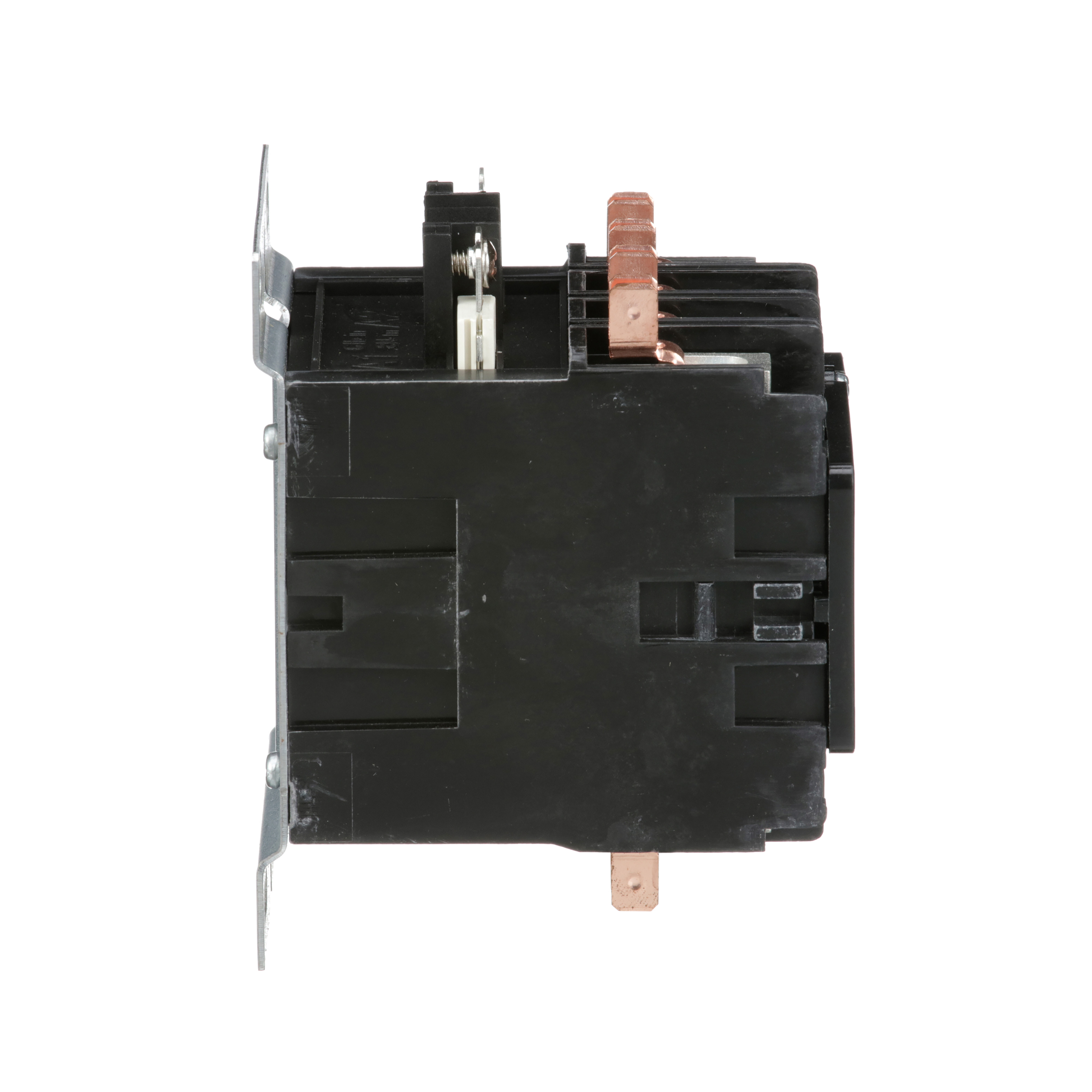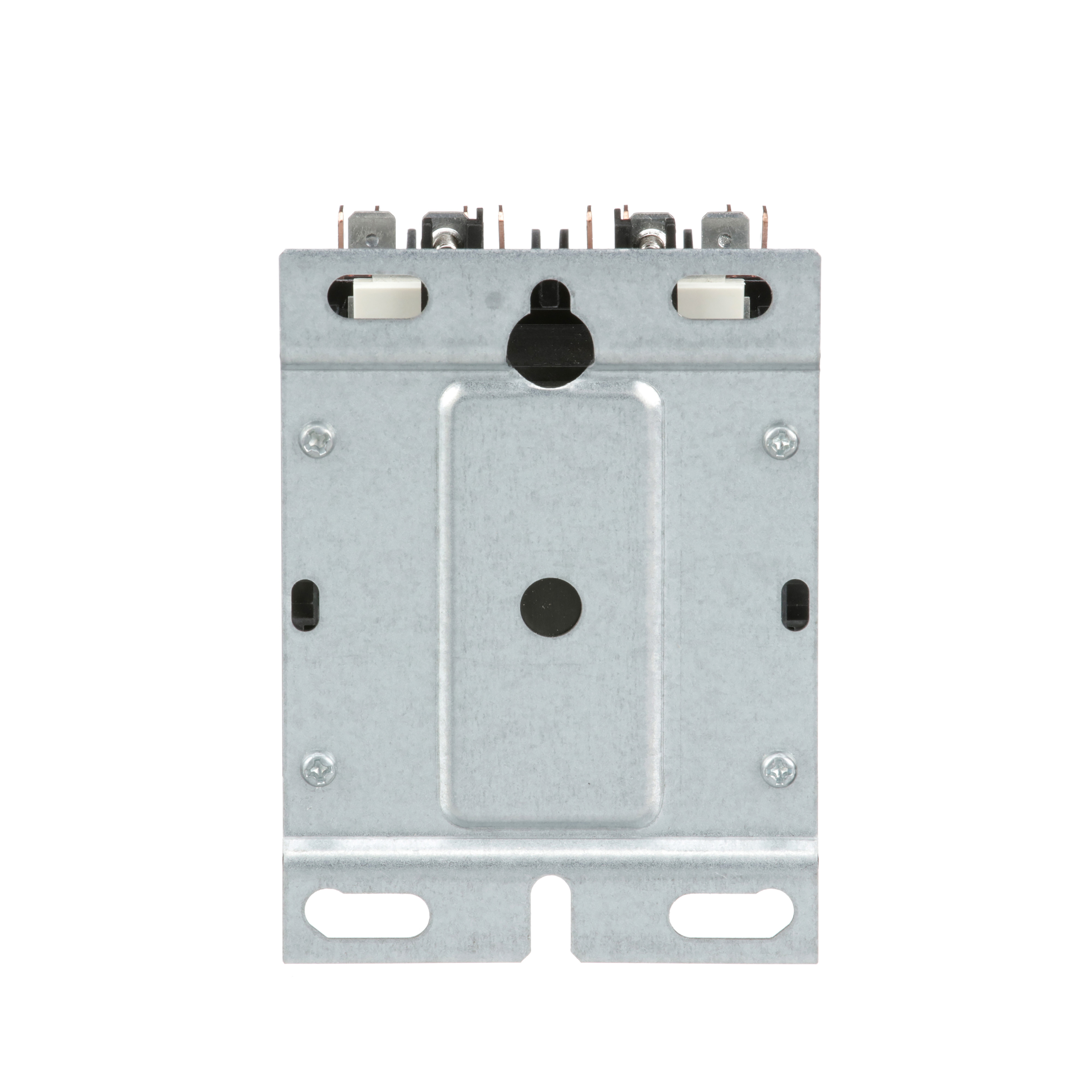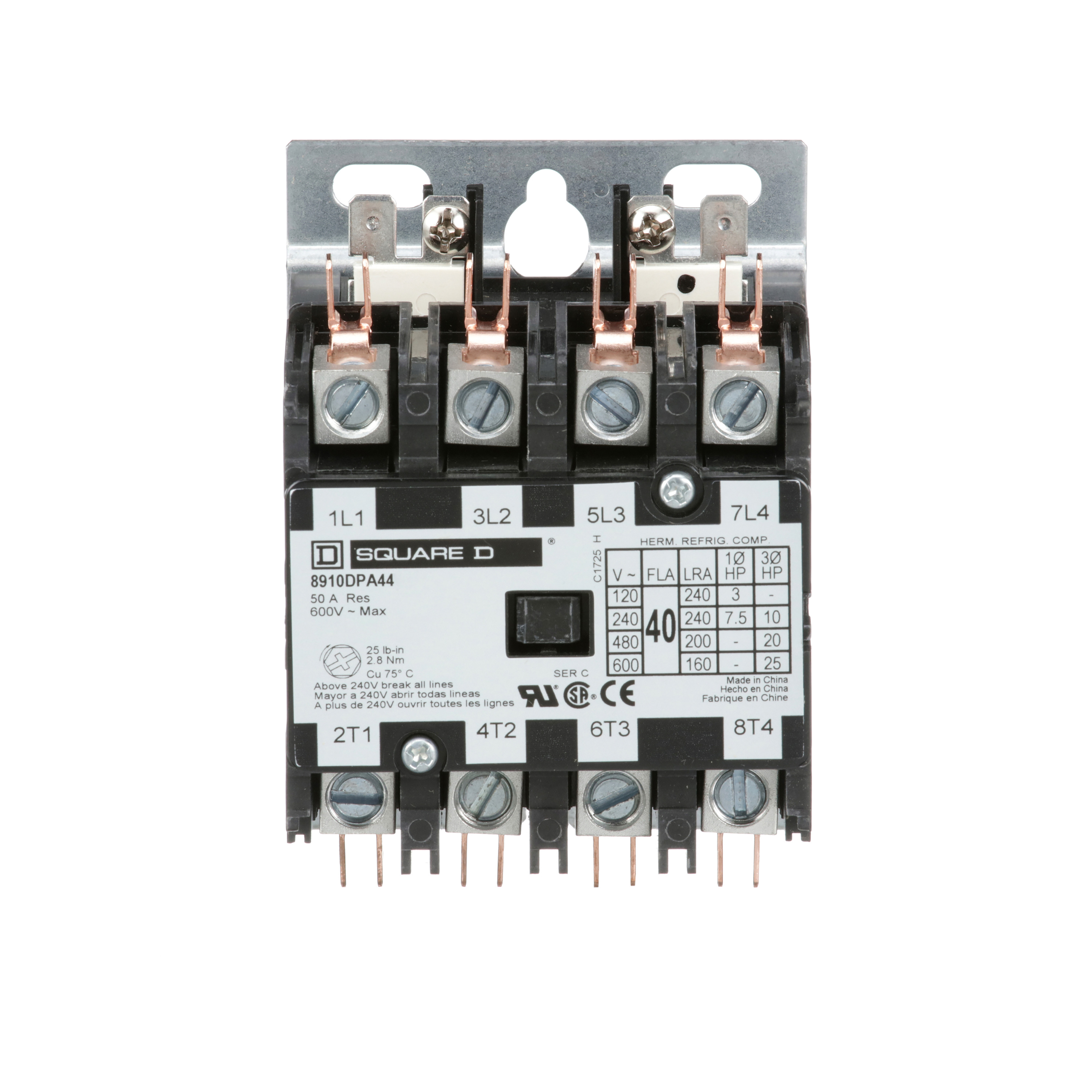 Square D™ 8910DPA44V09 magnetic contactor, definite purpose, for heating, air conditioning and refrigeration applications, 4-pole, 40 A (inductive) and 50 A (resistive) maximum at 600 V, 208 to 240 VAC, 50/60 Hz. operating coil, UL recognized, CSA Certified, CE marked, open style, with Type 1 enclosure and DIN mounting bracket available.