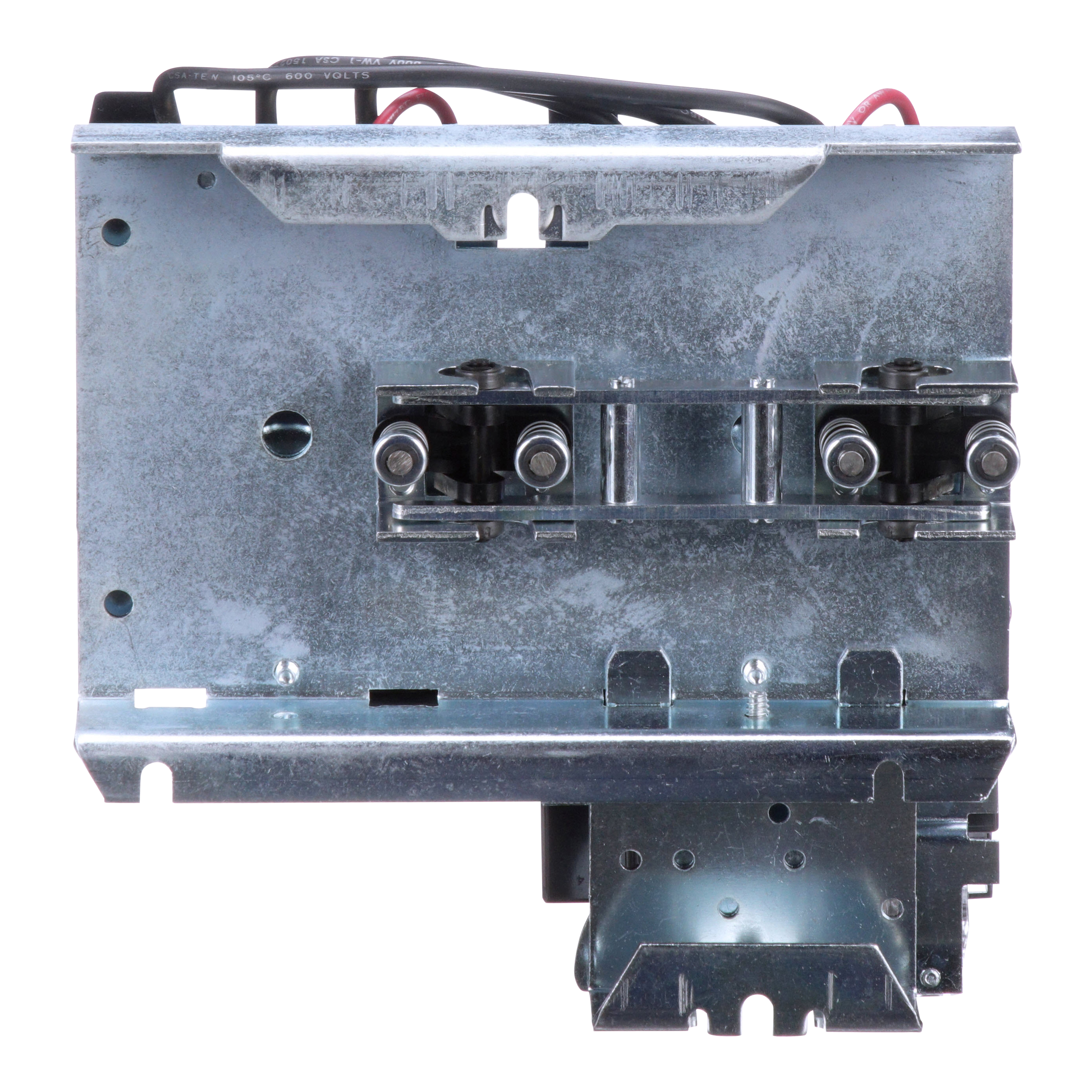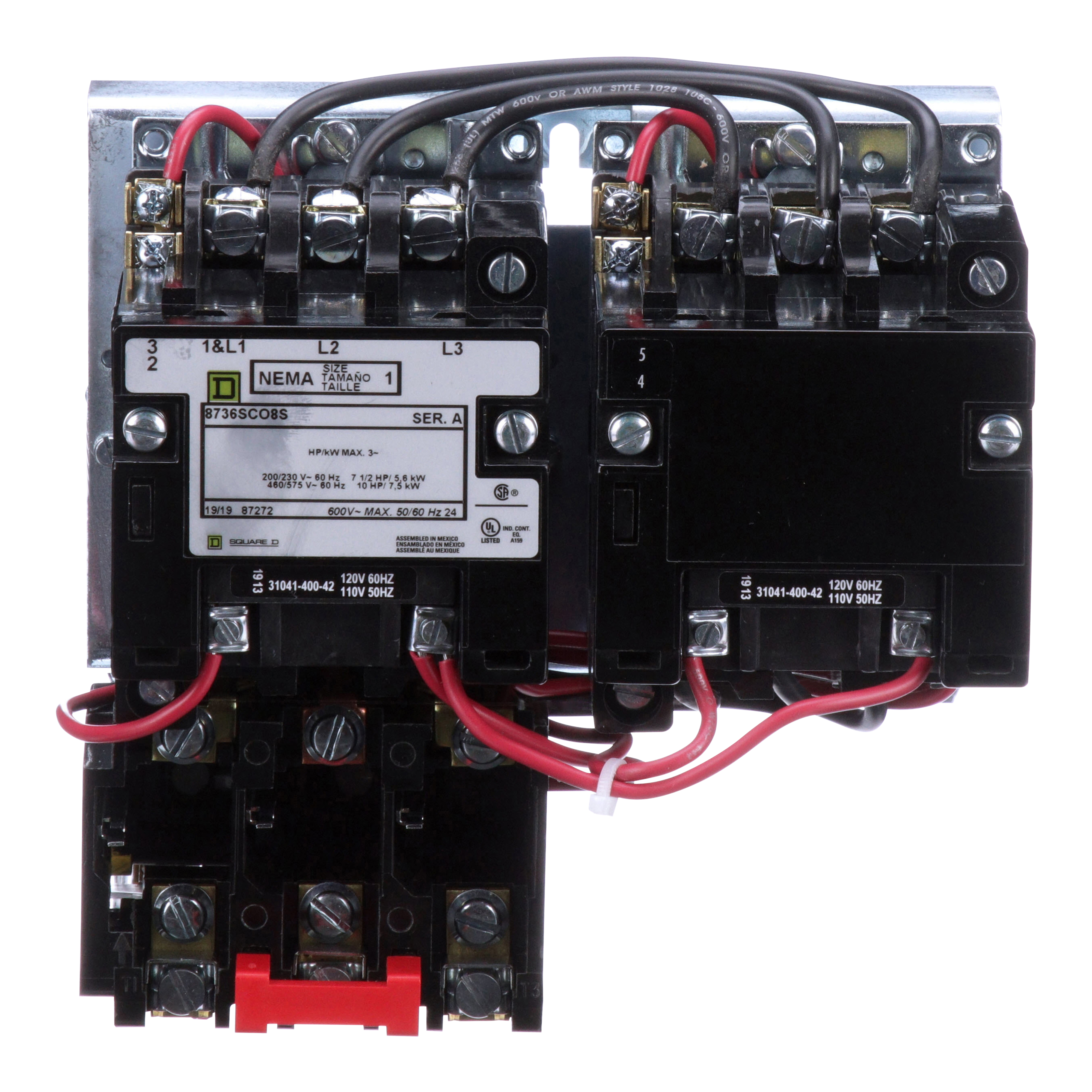 Square D 8736SCO8V02S reversing magnetic starter for motor applications, nema size 1, 10 hp at 600 vac maximum, 27 amperes, 3 pole, with 110/120 VAC, 50/60 Hz operating coil wired for separate source, melting alloy type overload relay, UL Listed, CSA Certified, CE Marked, open style with various types of accessories and enclosures available.