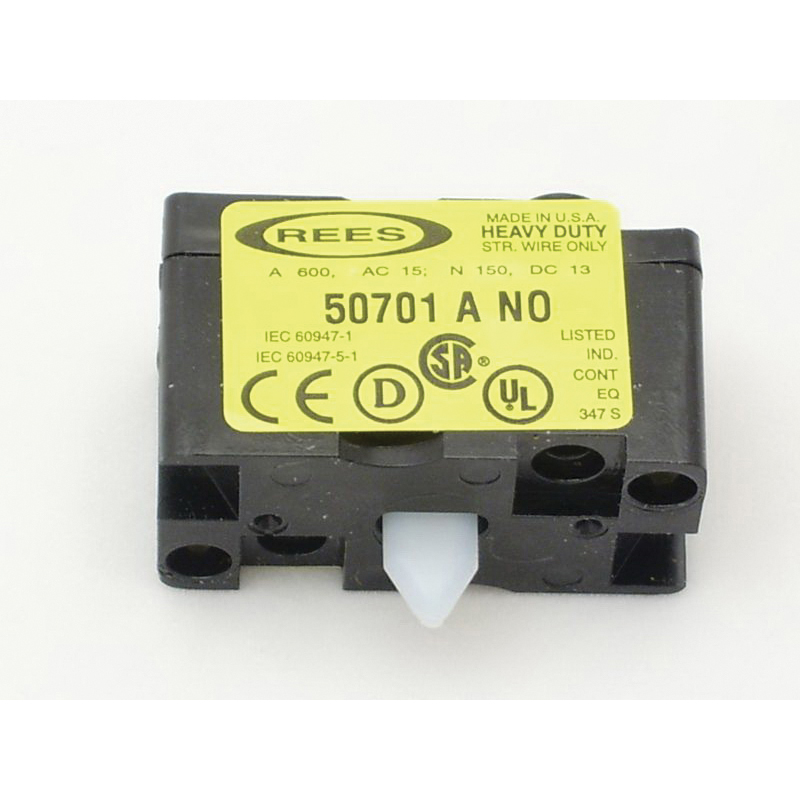 REES Contact Block, Heavy Duty, 30.5 mm Size, 1NO Contact Configuration, 1.2 A at 550 to 600 VAC, 2.2 A at 115 to 125 VDC Contact, Gold Plated Silver Contact, Pushbutton/Selector Switch Operator, NEMA 12/13 NEMA Rating, IP65 Enclosure, 3-Stack Mounting, 0.95 in H Dimensions