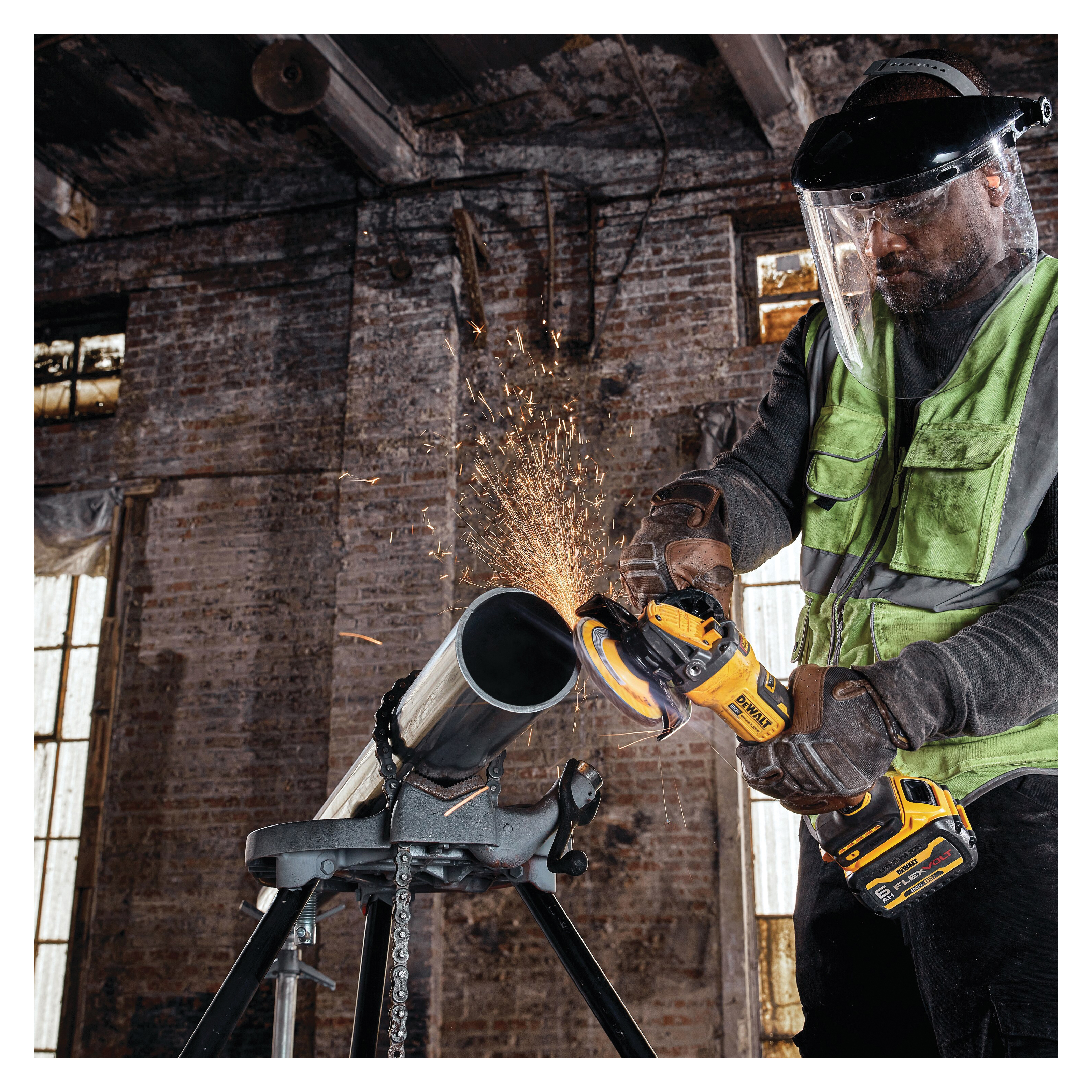 Take advantage of more power with our 20 V MAX brushless tools with FLEXVOLT® ADVANTAGE™ tool technology. The grinder has up to 54% more power when paired with a DCB606 FLEXVOLT® battery versus DCB205 20 V MAX battery. The brushless motor delivers 1550 max W out and up to 9000 rpm. This grinder is part of our PERFORM & PROTECT™ product line with kickback brake and E-CLUTCH® System. Battery and charger sold separately.